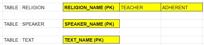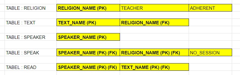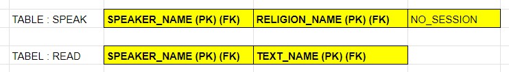 จากตัวอย่างเราจะแปลง Entity : SPEAKER , RELIGION , TEXT ไปเป็น Relation Table ซึ่งจะแปลงเป็น Table ได้ดังภาพ