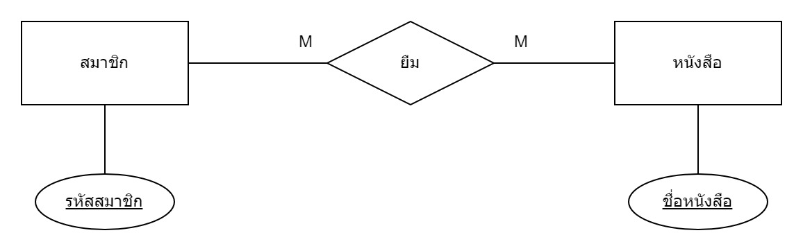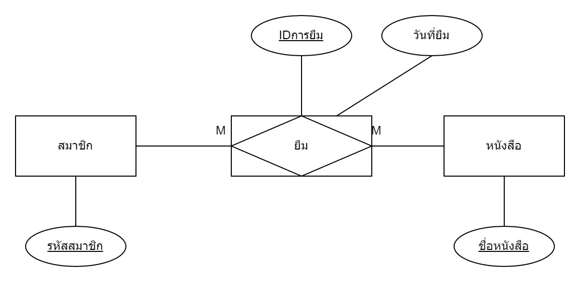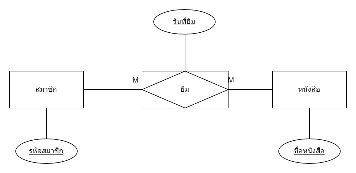 คราวนี้ถ้าเราอยากเก็บว่า M001 ยืมหนังสือชื่อ “Database Design” ไปแล้วกี่ครั้งมันจะทำไม่ได้เพราะ Primary key จะซ้ำ ตรงนี้บางท่านบอกว่างั้นก็เพิ่ม Attribute วันที่ยืมเข้าไปสิ ซึ่งก็ทำได้ครับ พอทำแล้วสัญลักษณ์จะเปลี่ยนไปเป็นแบบภาพด้านล่าง เพื่อให้เข้าใจว่า Relationship แบบนี้เกิดซ้ำได้